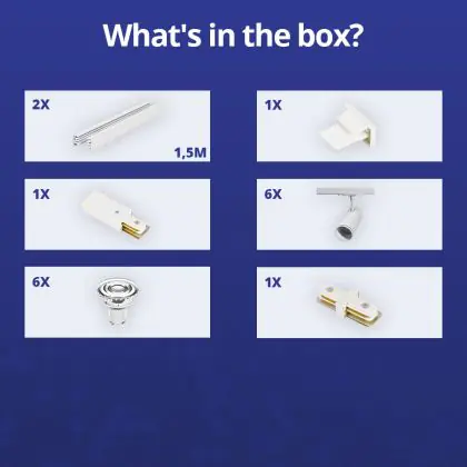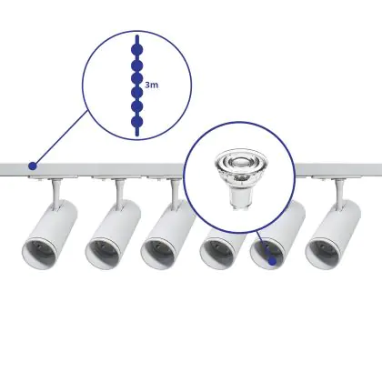 Description Ensemble complet Rail Monophasé Rail 3 Mètre Blanc | incl. 6x Spot + GU10 2700K 3W Dimmable + Embout, Connecteur d’Alimentation et I-Connecteur