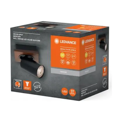 L’applique murale LED Ledvance LED Decor Spot Mercury Échantillon Noir 3.4W 230lm - 927 | Dimmable - Meilleur Rendu De Couleur est le luminaire idéal pour l’éclairage des endroits domestiques pouvant être humide et poussiéreux. Avec son indice de protection IP20, ce luminaire peut résister aux jets d’eau et à la poussière. On retrouve très souvent ce type d’éclairage dans les parkings, les cages d’escaliers, les halls d’immeubles… Ledvance propose une applique murale disposant de la technologie LED Intégré, vous permettant ainsi d’avoir un luminaire avec un faible impact sur l’environnement et capable de tenir jusqu’à 25000 heures.