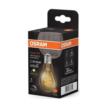 Cette ampoule Osram Vintage 1906 LED Classic E27 Poire Filament Dorée 4.9W 470lm - 927 | Meilleur Rendu De Couleur - Dimmable - Remplacement 40W avec son efficacité lumineuse de lumen par watt vous permettra de profiter d’un éclairage de qualité. Avec sa durée de vie de 15000 heures, vous n’aurez pas à vous soucier de son remplacement avant quelques années.